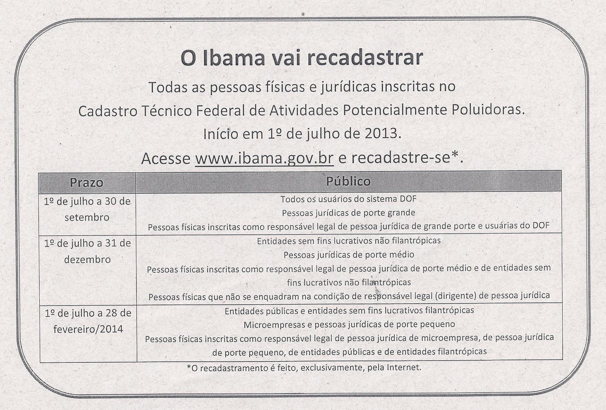 A Instrução Normativa do Cadastro Técnico Federal obriga o recadastramento das pessoas inscritas no CTF/APP a partir de 1° de julho de 2013. A atualização e confirmação dos dados obedecerá os seguintes prazos: