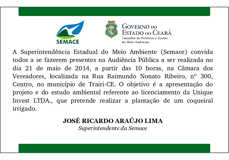 Semace convida população para audiência pública em Trairi