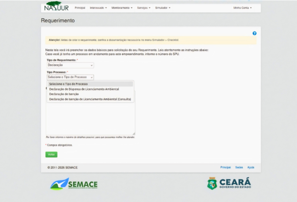 A Superintendência Estadual do Meio Ambiente (Semace) disponibilizou, no sistema Natuur, plataforma digital utilizada para a tramitação de processos e solicitação de serviços ambientais, o requerimento para Declaração de Dispensa de Licenciamento Ambiental. A ferramenta já está acessível à população e permite a formalização do pedido de forma digital.